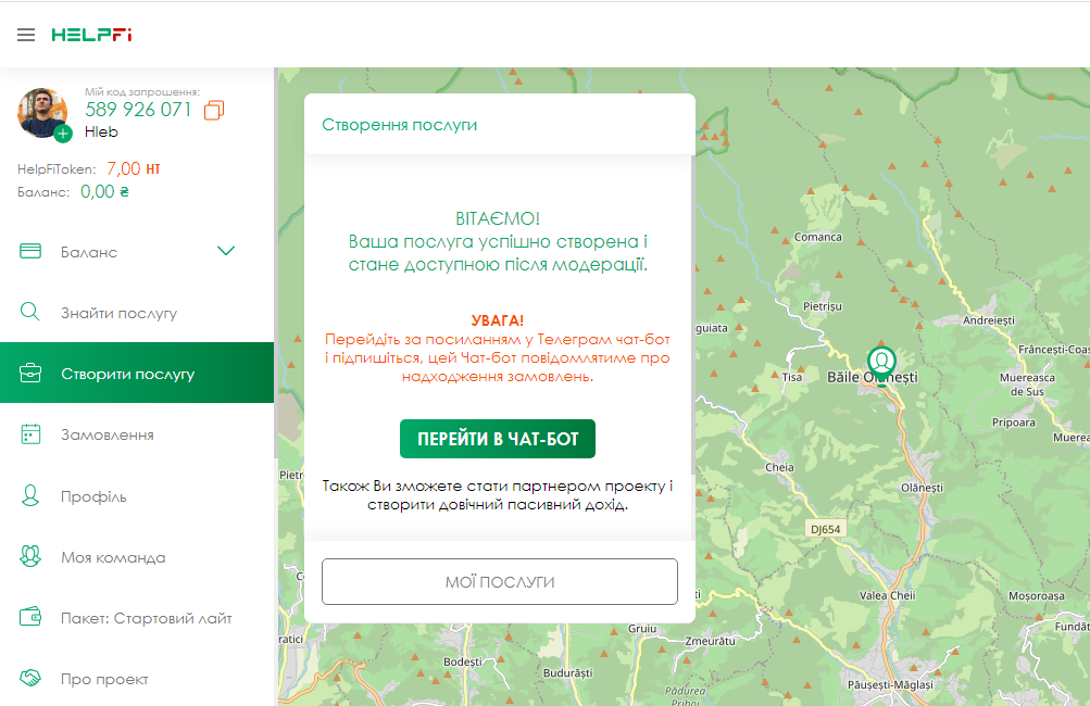 Ваша послуга була створена і додана в список. Тут вам потрібно перейти в чат-бот, щоб отримувати замовлення, повідомлення та новини компанії, а також ви можете перейти в інші розділи додатку, щоб дізнатися детальну інформацію про те, як ще ви можете заробити з HelpFi.