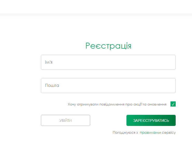 Далі введіть своє ім'я та адресу електронної пошти і натисніть кнопку "Зареєструватись".